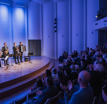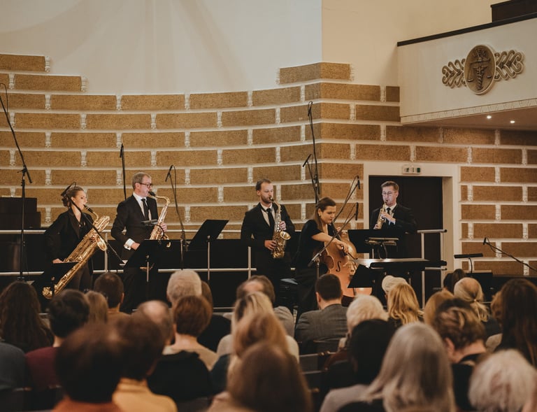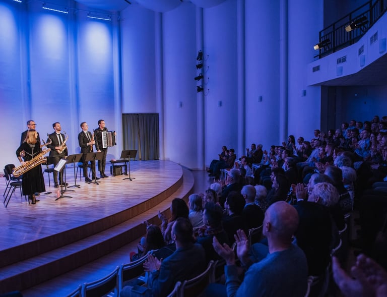 The RSQ performs frequently not only at the concert halls, but also at schools and churches, palaces and receptions, exhibition openings, open-air venues, etc. The RSQ performances with their unyielding artistic aspirations and refined timbre quality and professional skills have been recognized by audiences, critics and music specialists alike. By selecting wide-ranging repertoire the quartet has also made a considerable effort in breaking the stereotype of the saxophone as a purely jazz instrument – the ensemble performs transcriptions of classical works (J.S. Bach, G. Gabrieli, G.F. Handel, and B. Marcello), original 20th and 21st century works (Andrew Poppy, Gabriel Jackson, Carleton Macy, Joe Cutler, Perry Goldstein, etc.), repertoire associated with the lyrical melodies and engaging rhythms of Latin American music as well as original compositions and arrangements of world famous jazz composers (G. Gershwin, D. Gilespy, G. Gershwin, D. Gillespie, D. Ellington, Ph. Woods, M. Mower and others).